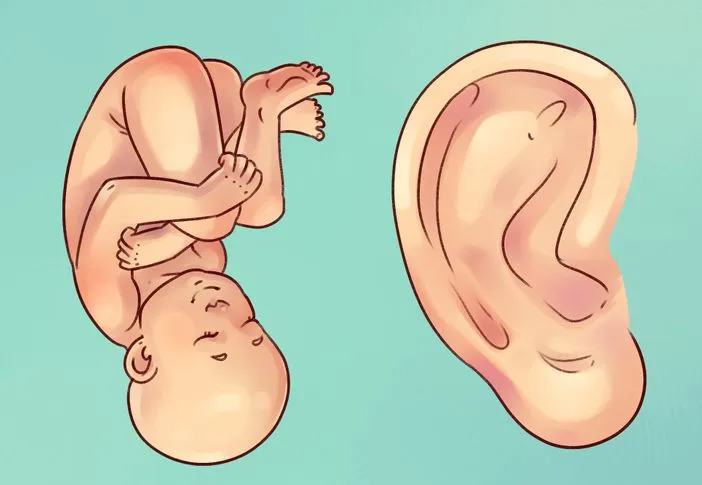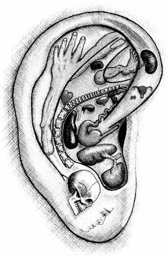 Als we aandachtig naar een oorschelp kijken, kunnen we de trekken van een foetus herkennen: het hoofd in de oorlel, de wervelkolom in de oorplooi, de benen opgetrokken in de foetushouding. Het weerspiegelt het menselijke lichaam in proportie.